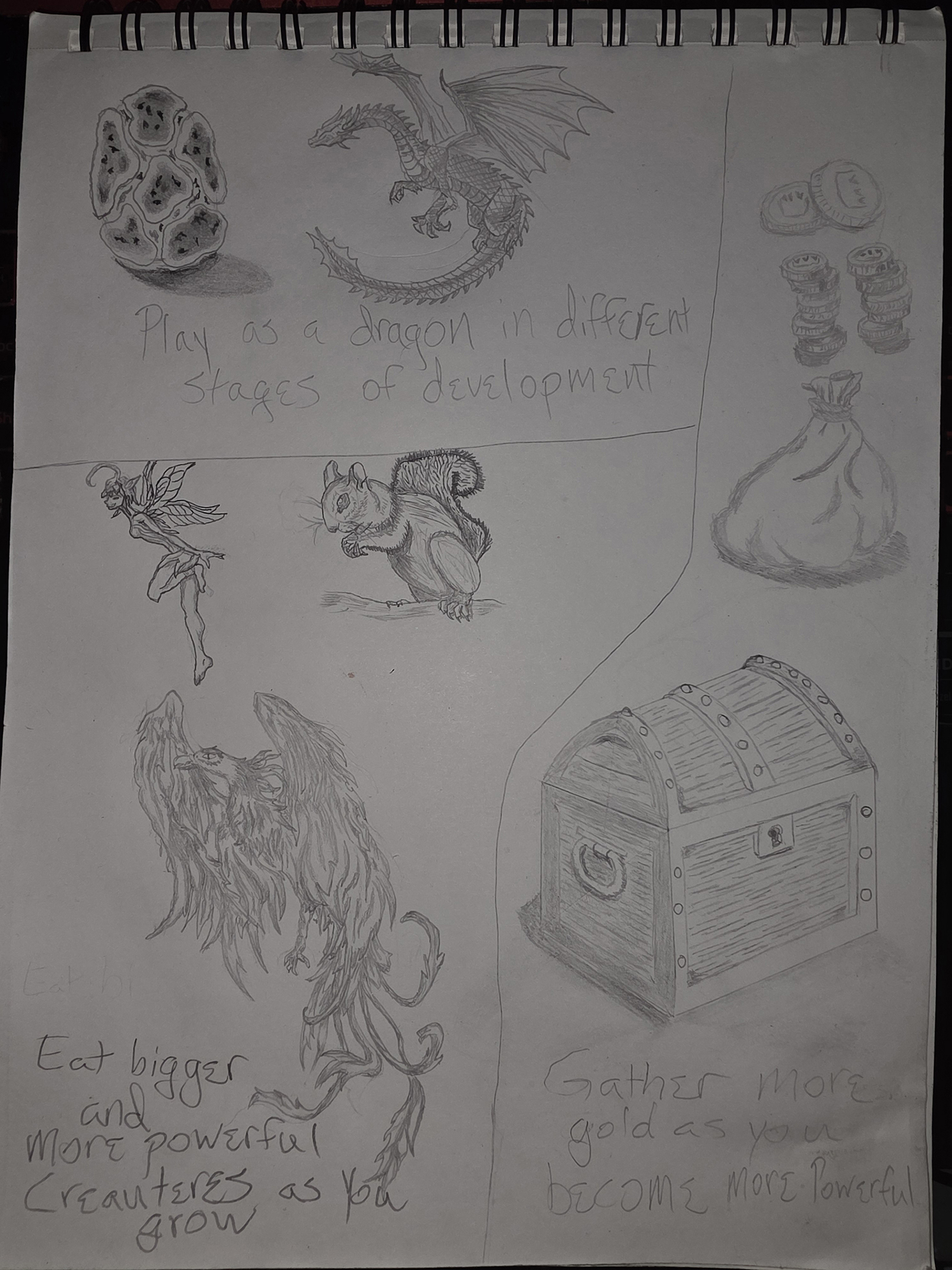 Here you can see some of the initial ideas that I came up with when I originally thought of Migration. At the top of the page you see a fire dragon's egg in the late stages of cooling. In this game, the kind of dragon being born is reflected from the egg. With fire dragons, their eggs come out ass semi solid magma eggs that solidify into lava rock to protect the wyrmling as it gestates. Once you hatch you are free to explore the world and start wreaking havoc on an unsuspecting world. The lower portion of this image shows different creatures (namely a pixie, a squirrel, and a phoenix). This symbolizes that every dragon needs to eat in order to grow big and fearsome, what better prey than the denizens of your world? Finally, every dragon is known for hoard vast amounts of treasure. As you grow and eat, you can gather whatever treasure your poor victims may have had on them at the time of their untimely, yet delicious, demise. You may also accrue wealth as tributes from followers and/or victims in exchange for not devouring them!